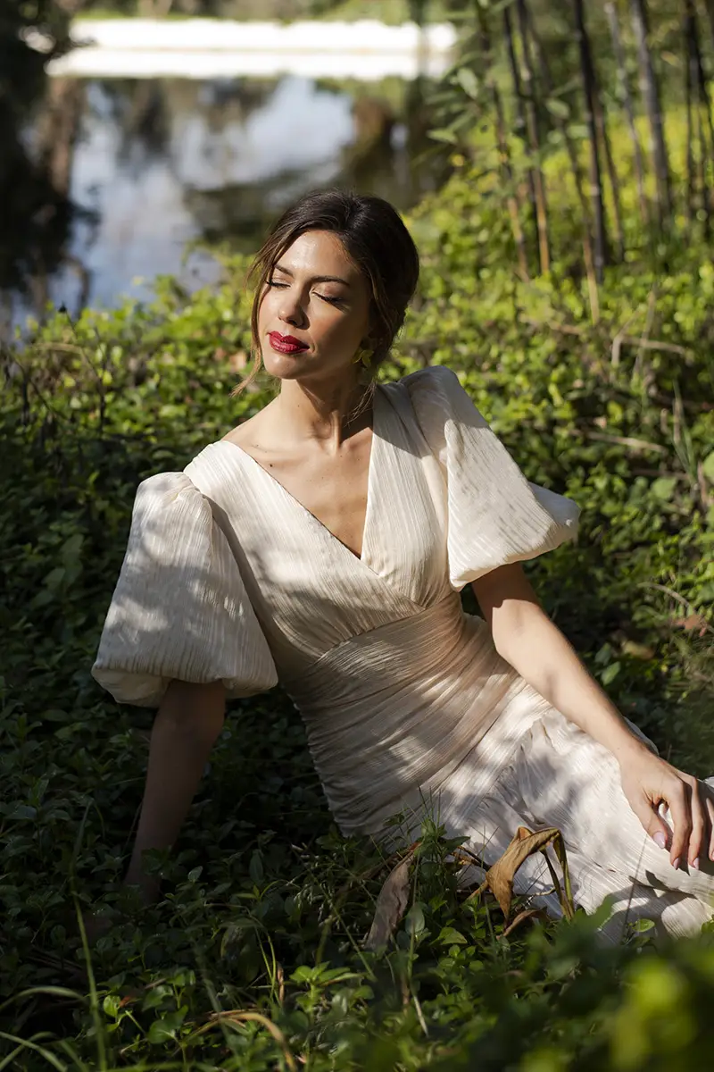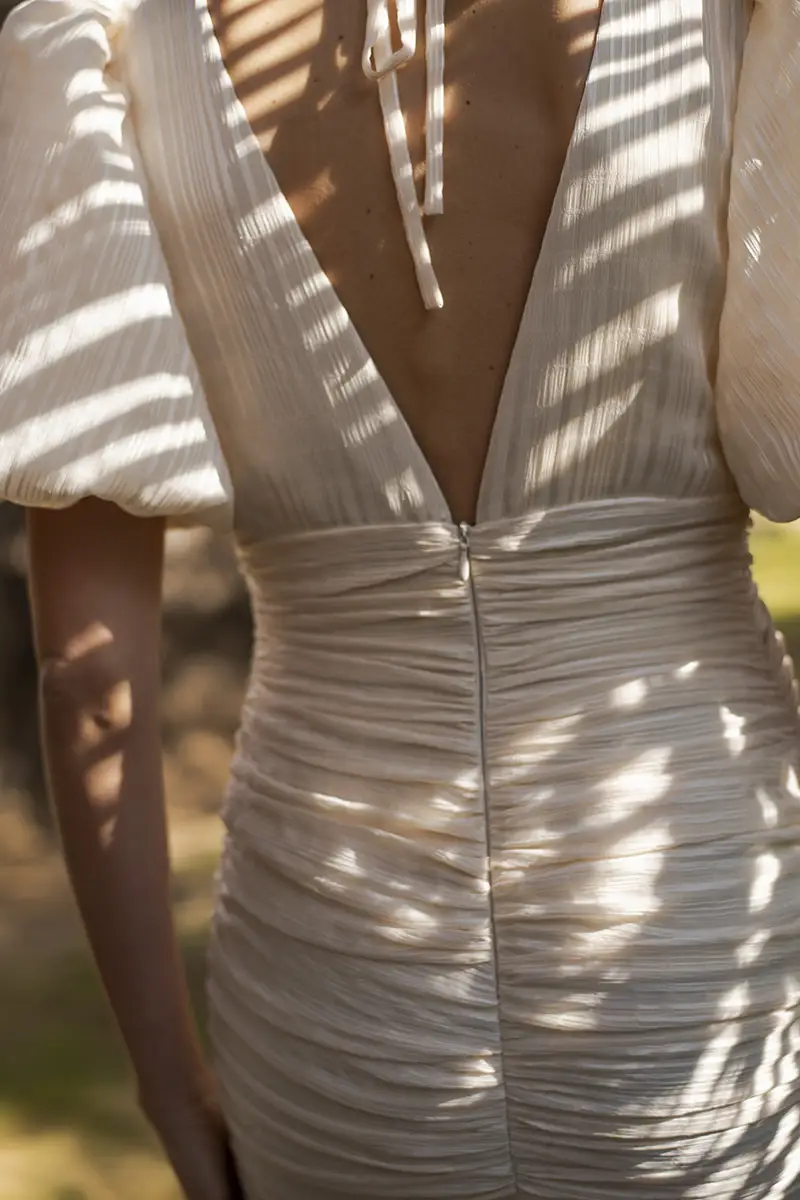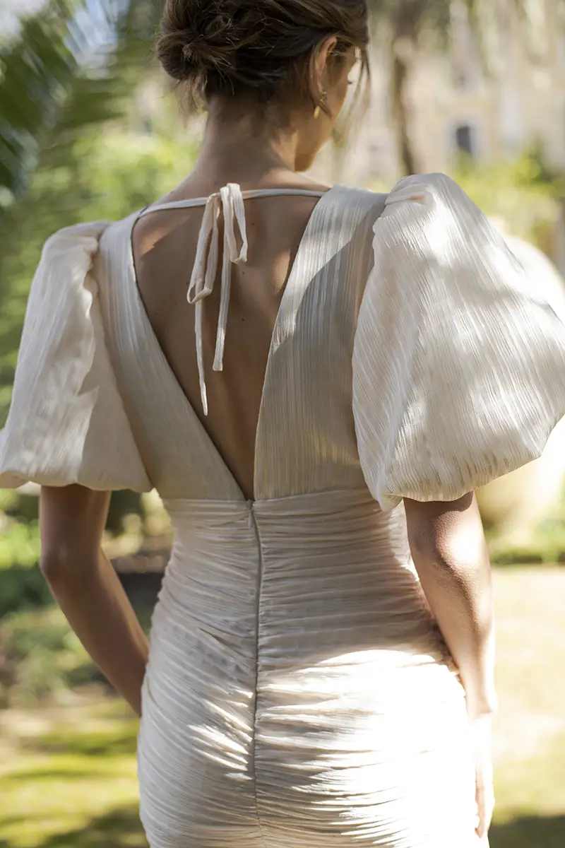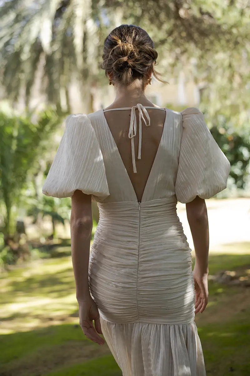 La espalda descubierta en forma de pico añade un toque muy especial al diseño, dejando una imagen preciosa y equilibrada también desde atrás. Está confeccionado en una gasa con un efecto ligeramente rayado, sutil y sofisticado, que aporta textura. El vestido va completamente forrado y entretelado, garantizando empaque, comodidad y una caída impecable.