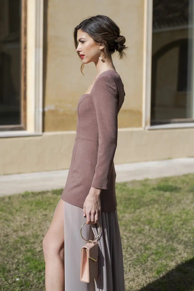 También es una opción muy acertada para mamás de comunión que desean salirse del vestido tradicional sin renunciar a la elegancia. Gracias a su doble lectura —estructura corta en la parte superior y falda larga de gasa muy ligera— el resultado es sofisticado, equilibrado y perfectamente adecuado para este tipo de celebraciones.