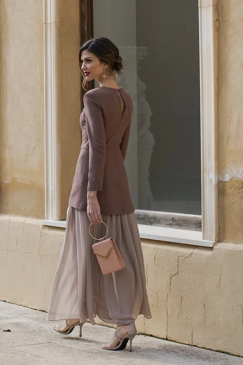 El vestido Edwina moka, es un vestido largo que destaca por un juego de contrastes muy cuidado entre estructura y fluidez, convirtiéndose en una de las piezas más especiales de la colección. El cuerpo está confeccionado en un tejido sastre, propio de traje de chaqueta, que aporta presencia, empaque y una caída impecable, aunque se trate de un vestido.