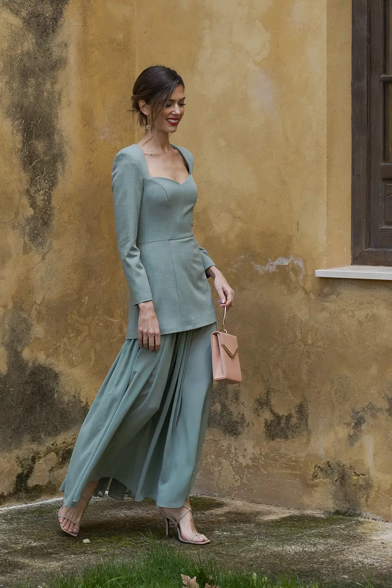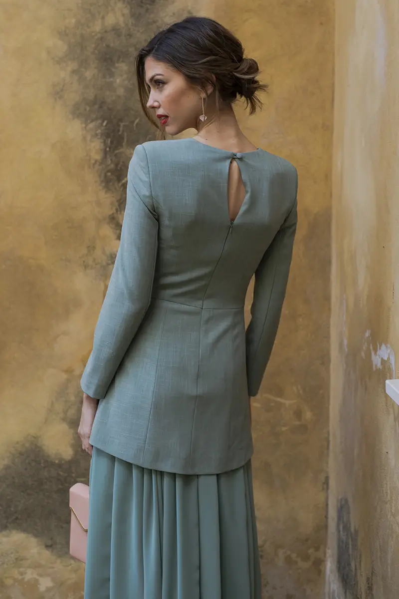 El vestido Edwina verde, es un vestido largo que destaca por un juego de contrastes muy cuidado entre estructura y fluidez, convirtiéndose en una de las piezas más especiales de la colección. El cuerpo está confeccionado en un tejido sastre, propio de traje de chaqueta, que aporta presencia, empaque y una caída impecable, aunque se trate de un vestido.
