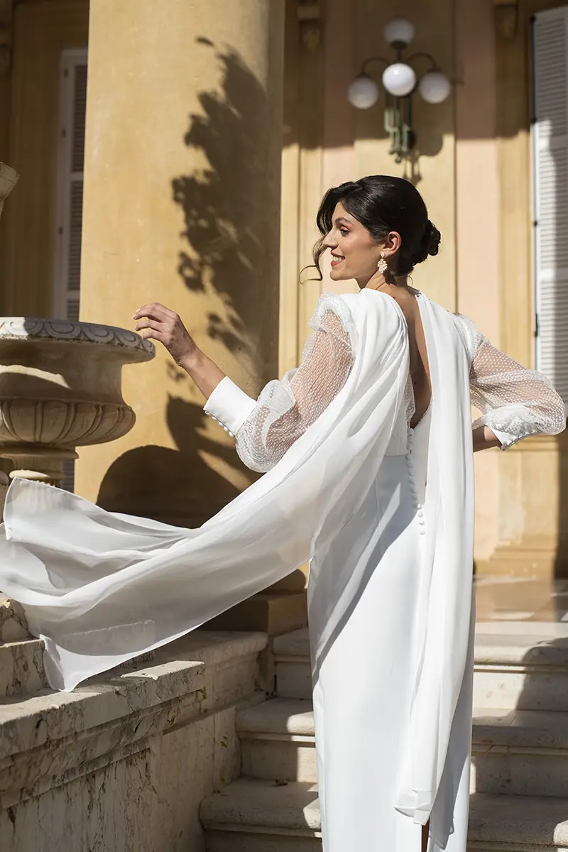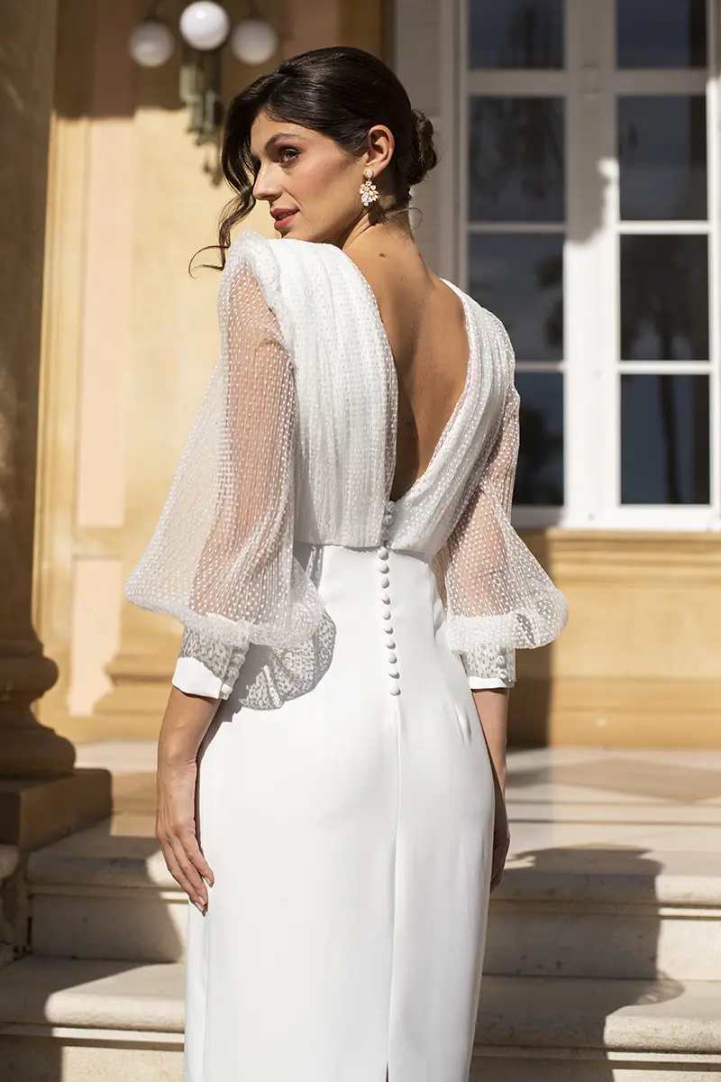 La espalda descubierta en forma de pico añade un guiño sensual, enmarcada por una hilera de pequeños botoncitos forrados que decoran la falda y aportan un acabado artesanal precioso.