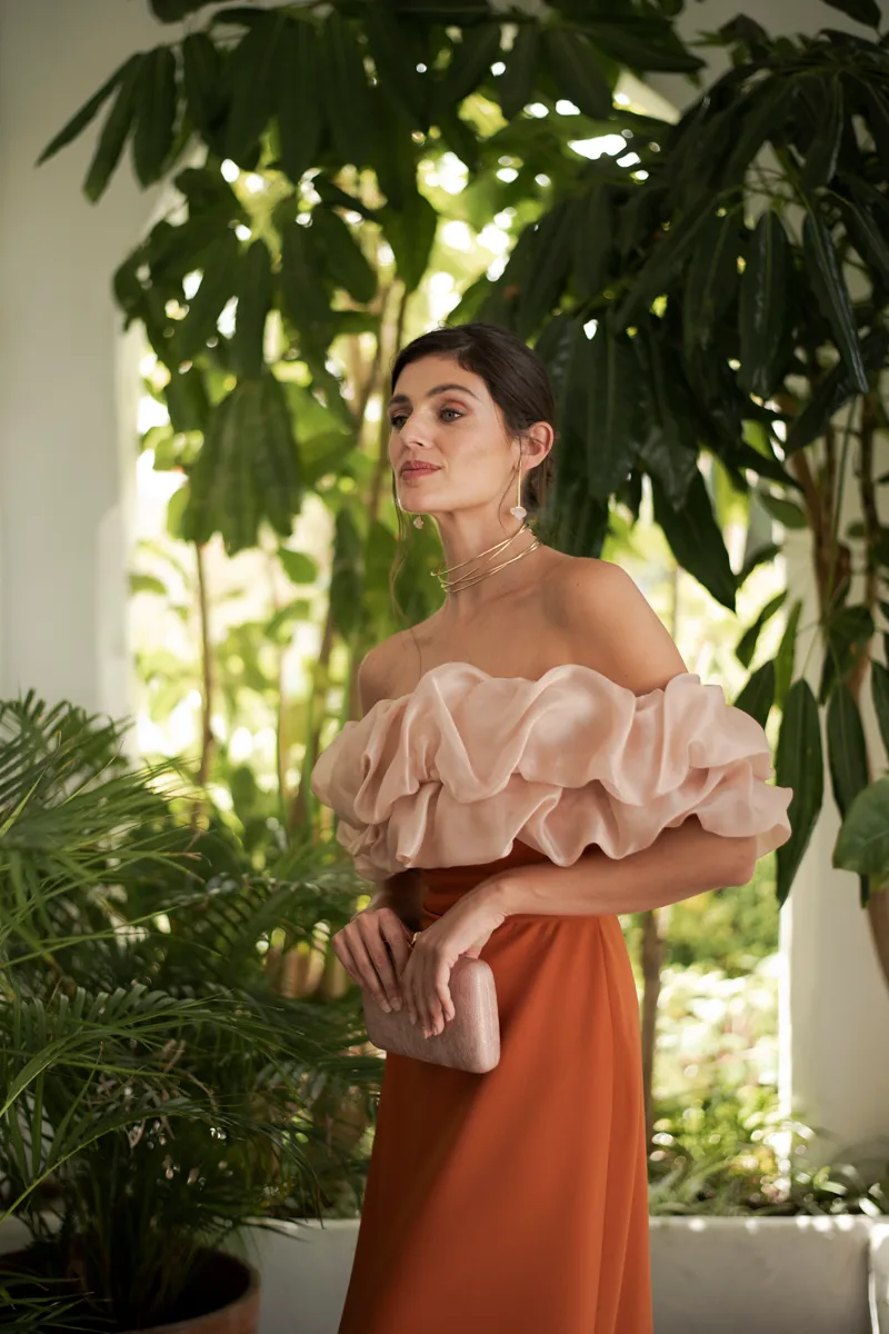 Está pensado para invitadas con un papel protagonista, como hermanas de la novia, madrinas o amigas cercanas, que necesitan un estilismo con carácter y presencia muy femenino. También es una buena opción para otros eventos especiales de verano, como cenas importantes o celebraciones formales donde se requiere ir arreglada pero con frescura.